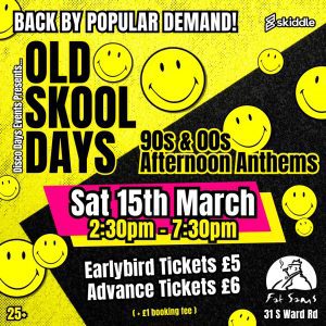 Old Skool Days is Back!By Booking / February 20, 2025 favorite_border iCal Export Google Calendar Outlook 365 Outlook Live 15 Mar Old Skool Days is Back! Here we, here we, here we f**kin go again! Back by popular demand, Old Skool Days will take over Dundee on Saturday 15th March RUN don't walk to get your tickets, cause the 1st 30 are just £3 and following that, Earlybirds are only a fiver Don't miss an afternoon of 90s & 00s anthems and back to back bangers Be there or be 15 Mar Get Tickets Now Scan QR Code